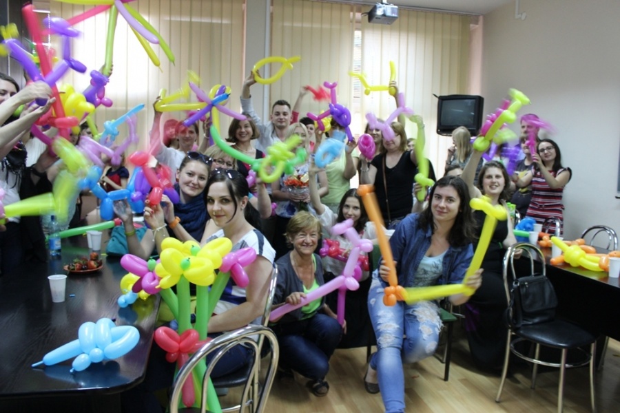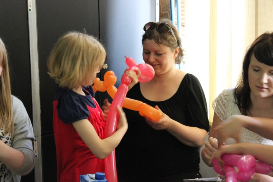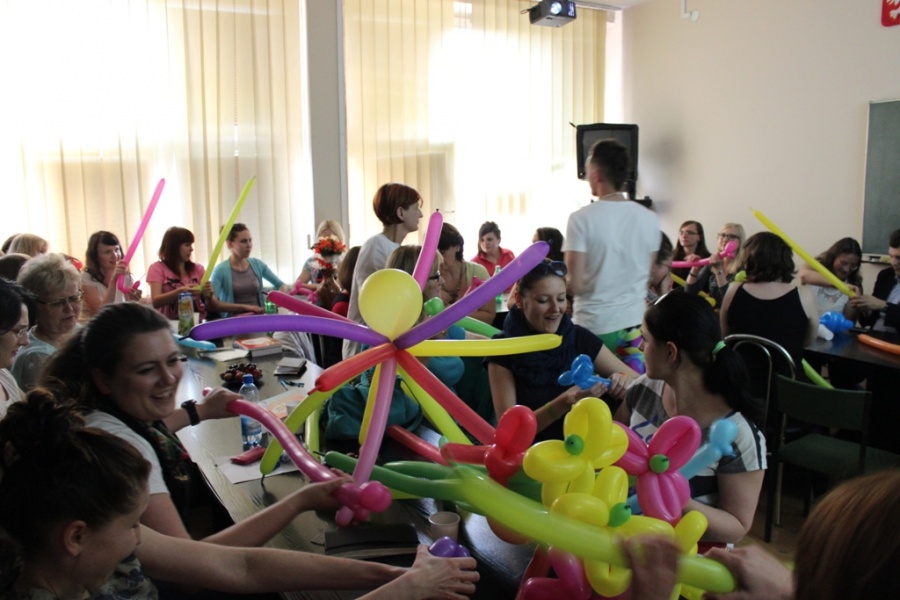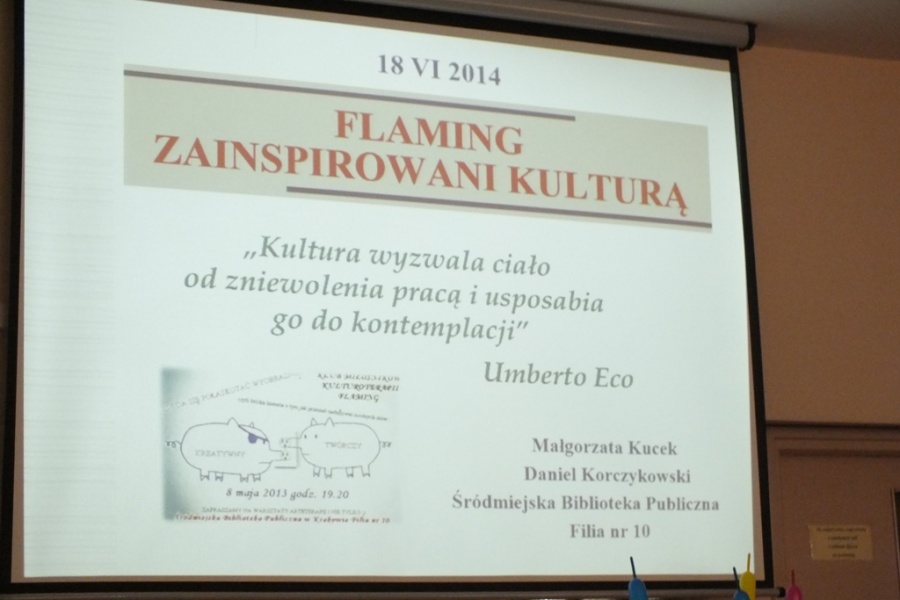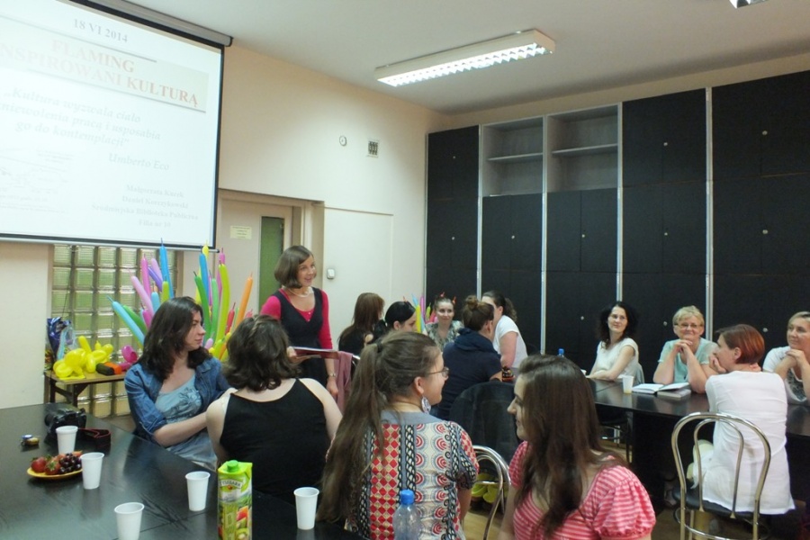 18 VI 2014 r. w ramach comiesięcznych spotkań Krakowskiego Koła Biblioterapeutów odbył się wykład: Flaming – zainspirowani kulturą… oraz warsztaty: Stwory i kolory. Pokaz skręcania modelin włoskich. Zajęcia poprowadzili: Małgorzata Kucek i Daniel Korczykowski (absolwent IINiB), zaś moderatorem spotkania była Wanda Matras – kierująca Krakowskim Kołem. Goście przedstawili bogactwo różnorodnych działań podejmowanych przez Klub Kulturoterapii Flaming, wpisujących się w nurt terapeutycznej funkcji kultury opisanej w książkach prof. Wity Szulc (Kulturoterapia. Poznań 1998; Arteterapia. Warszawa 2011). Następnie, po krótkim wprowadzeniu W. Matras do zagadnień Terapii śmiechem (Kielce, 2012) odbyła się część zasadnicza warsztatów. Spotkanie zgromadziło rekordową liczbę uczestników, którzy mogli najpierw obejrzeć mistrzowski popis skręcana modelin włoskich w wykonaniu Daniela Korczykowskiego a następnie samodzielnie wykonywali różne modele balonikowych postaci. W imieniu Zarządu Krakowskiego Koła Biblioterapetów oraz Klubu Kultoroterapii Flaming dziękujemy nauczycielom i bibliotekarzom małopolskich szkół, pracownikom bibliotek publicznych, pedagogicznych i naukowych oraz doktorantom i studentom Uniwersytetu Pedagogicznego i Uniwersytetu Jagiellońskiego za tak liczne przybycie.